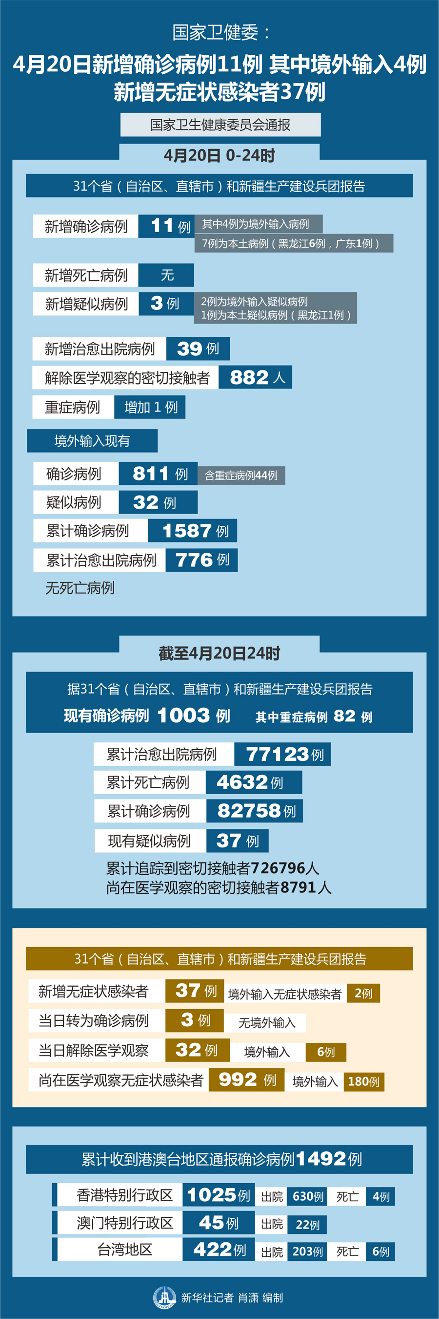 截至4月20日24時,據31個省(自治區、直轄市)和新疆生產建設兵團報告,現有確診病例1003例(其中重癥病例82例),累計治愈出院病例77123例,累計死亡病例4632例,累計報告確診病例82758例,現有疑似病例37例。累計追蹤到密切接觸者726797人,尚在醫學觀察的密切接觸者8791人。