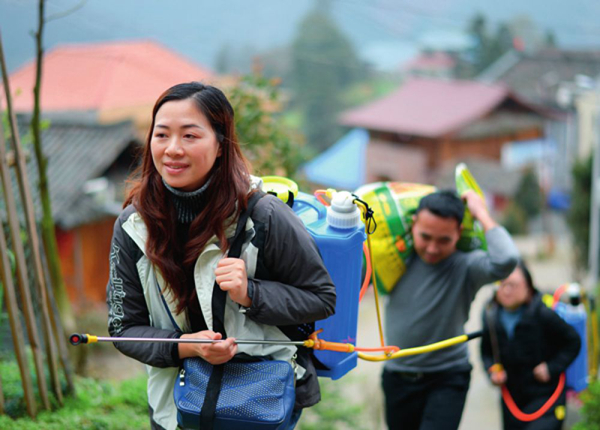 3月7日,貴州省錦屏縣河口鄉加池村,錦屏縣融媒體中心幫扶干部楊曉琴(左)和隊友給群眾送農用物資 楊楹攝