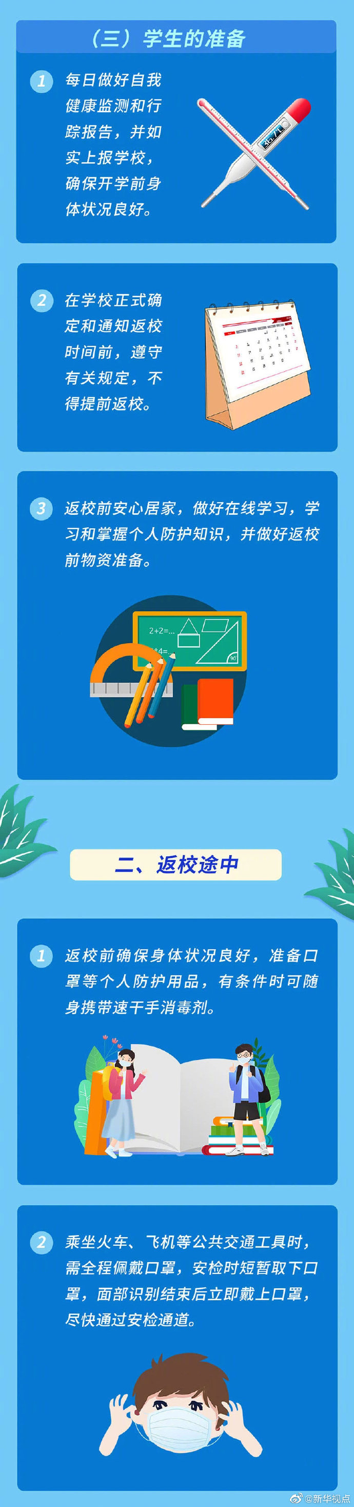 返校途中如何正確防護?開學后上課、用餐又該注意啥?周末還能出校改善伙食嗎?國家衛健委、教育部日前聯合印發《大專院校新冠肺炎疫情防控技術方案》,馬上開學的你,快收下這份防控寶典↓(圖片來源:健康中國)(記者溫競華) ?????