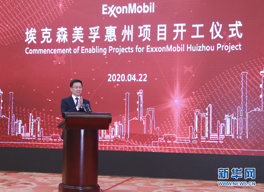 4月22日,埃克森美孚在粵港澳大灣區投資建設的廣東惠州乙烯項目舉行“云開工”儀式。中共中央政治局常委、國務院副總理韓正出席并宣布項目開工。 新華社記者 丁林 攝