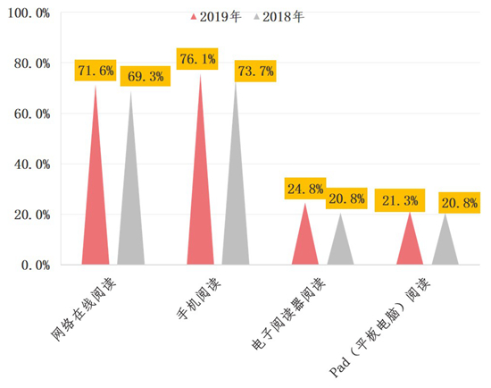 具體來看,2019年有76.1%的成年國民進行過手機閱讀,71.6%的成年國民進行過網(wǎng)絡在線閱讀,24.8%的成年國民在電子閱讀器上閱讀,21.3%的成年國民使用Pad(平板電腦)進行數(shù)字化閱讀,均較2018年有所上升。