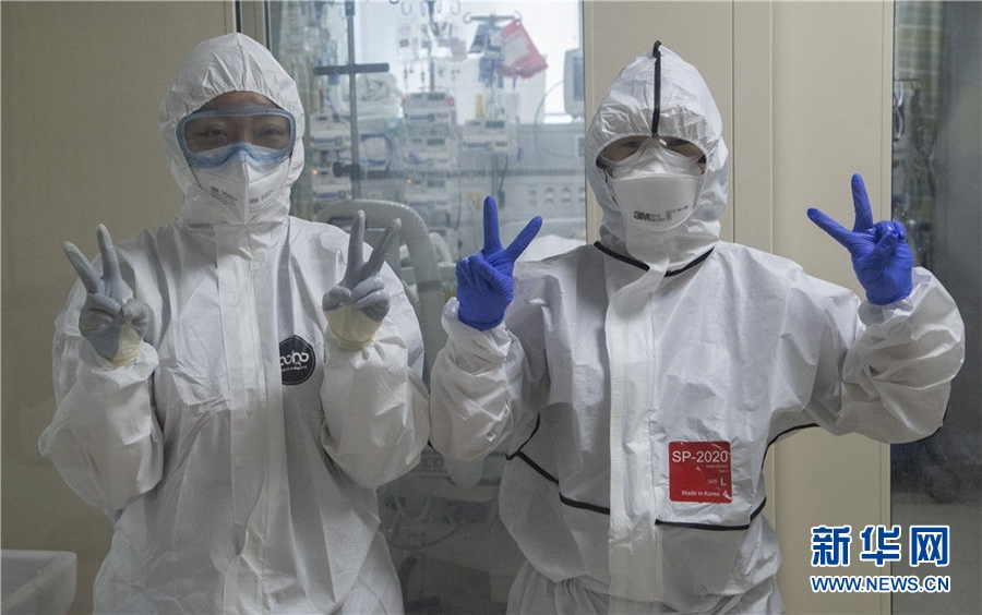 3月18日,在韓國(guó)大邱啟明大學(xué)東山醫(yī)院,醫(yī)護(hù)人員對(duì)記者擺出勝利手勢(shì)。新華社發(fā)(李相浩攝)