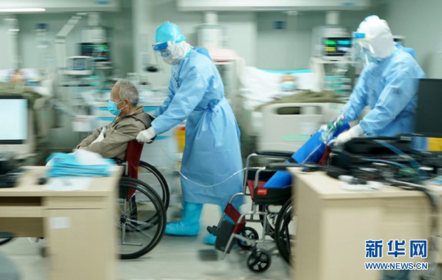 3月20日,武漢火神山醫(yī)院重癥醫(yī)學(xué)一科副主任宋立強(qiáng)(中)護(hù)送81歲的新冠肺炎重癥患者去做CT檢查。為確保患者有充足供氧,醫(yī)生胡世頡推著氧氣瓶隨行。新華社記者 王毓國(guó) 攝