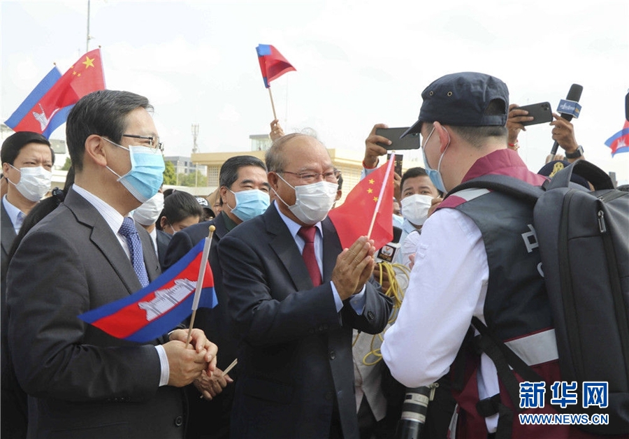 3月23日,在柬埔寨首都金邊,柬埔寨衛(wèi)生大臣曼本亨(中)在機(jī)場(chǎng)迎接中國(guó)抗疫醫(yī)療專家組。新華社記者 毛鵬飛 攝