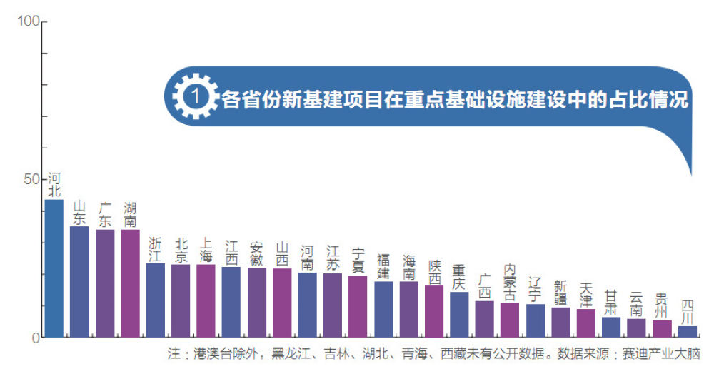 通過搜集分析全國已經(jīng)公開的26個省份年度重點基礎(chǔ)設(shè)施項目投資計劃,按照官方文件中提到的5G、數(shù)據(jù)中心、物聯(lián)網(wǎng)、工業(yè)互聯(lián)網(wǎng)等作為新型基礎(chǔ)設(shè)施的口徑標準,本刊計算了各省市新基建項目在重點基礎(chǔ)設(shè)施建設(shè)中的占比情況。(見圖1)