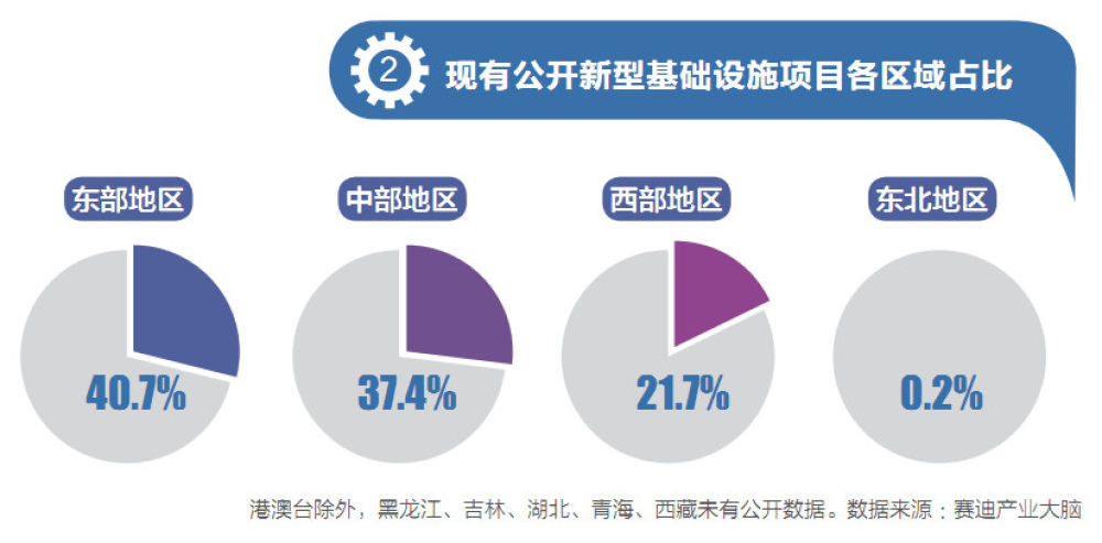 據(jù)統(tǒng)計,納入省級重點投資計劃的新型基礎(chǔ)設(shè)施項目,東部地區(qū)共有406項、中部地區(qū)373項、西部地區(qū)216項,而東北地區(qū)僅有2項。(見圖2)