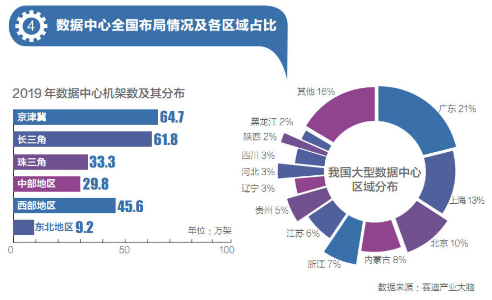 數(shù)據(jù)中心方面,國內(nèi)在運營的數(shù)據(jù)中心,主要集中在京津冀城市群、長三角城市群、粵港澳大灣區(qū)等地區(qū),共占據(jù)整體市場50%以上的份額。(見圖4)