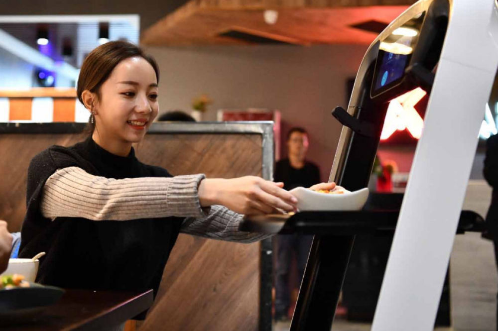 2018年11月10日,中新天津生態城“X 未來餐廳”,顧客通過自動駕駛機器人取菜(李然/攝)