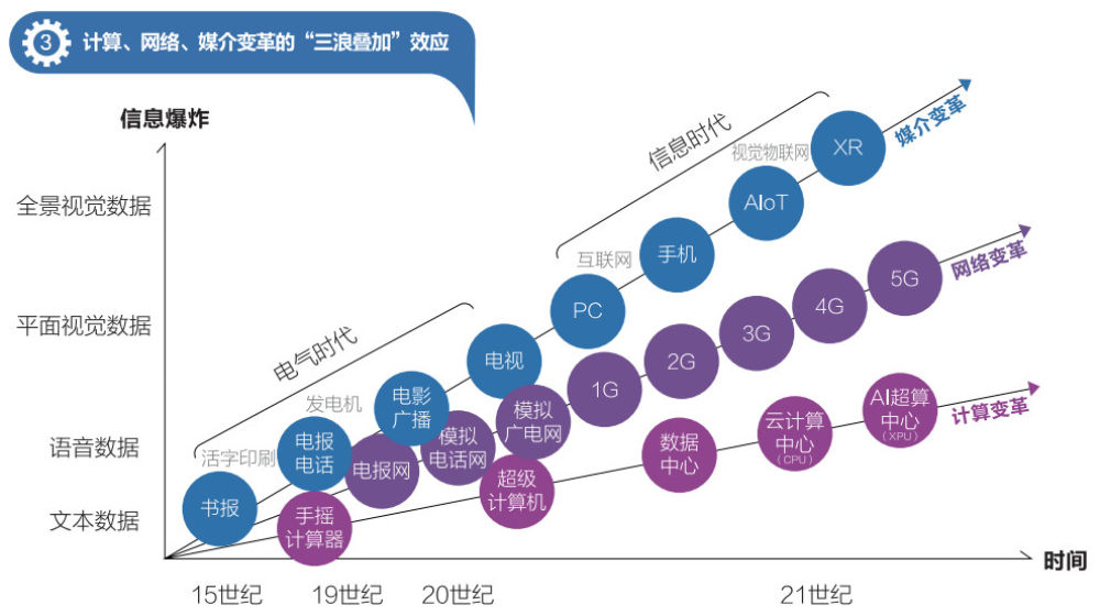其中,芯片能力按照摩爾定律發展,計算能力大幅提升網絡性能,更高帶寬、更低時延的網絡帶來媒介終端的顛覆式升級,進而帶來基于電報、電話、廣播、電視、PC、手機、XR(擴展現實)等網絡的新商業市場。