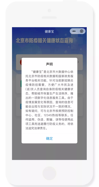 “健康寶”是北京市大數(shù)據(jù)中心依托北京市防疫相關(guān)數(shù)據(jù)和國(guó)家政務(wù)服務(wù)平臺(tái)相關(guān)功能,針對(duì)當(dāng)前新冠肺炎疫情防控需要,方便廣大市民及進(jìn)(返)京人員查詢自身防疫相關(guān)健康狀態(tài),幫助城市恢復(fù)生產(chǎn)生活秩序,推出的一項(xiàng)數(shù)字化信息服務(wù)工具。