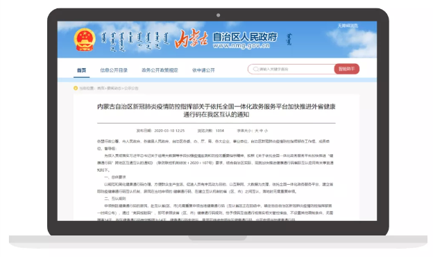 內(nèi)蒙古自治區(qū)以規(guī)范和簡(jiǎn)化健康通行碼辦理、方便群眾生產(chǎn)生活、促進(jìn)人員有序流動(dòng)為目的,以互聯(lián)網(wǎng)、大數(shù)據(jù)為支撐,依托全國(guó)一體化政務(wù)服務(wù)平臺(tái),建立省際防疫健康通行碼互認(rèn)機(jī)制,居民在當(dāng)?shù)厣觐I(lǐng)的健康通行碼,在建立互認(rèn)機(jī)制的省(區(qū)、市)之間互認(rèn),出行時(shí)無(wú)需重復(fù)申領(lǐng)。