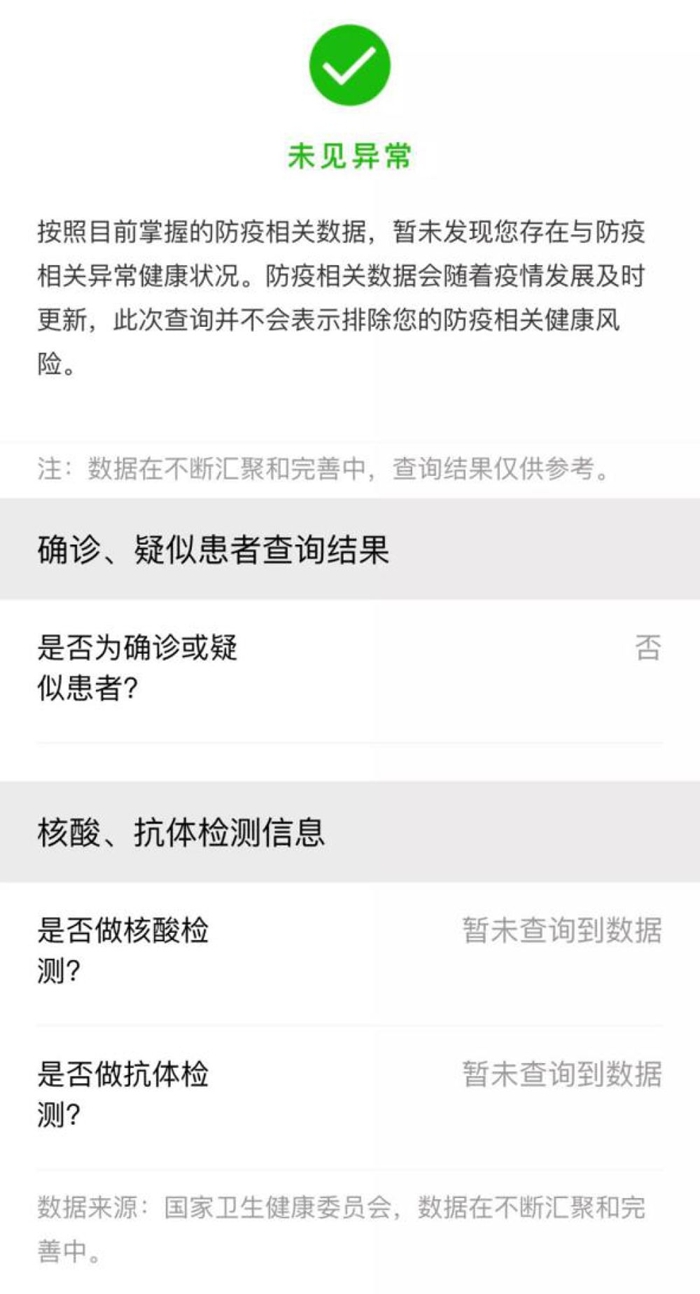 記者注意到,核酸、抗體檢測信息查詢服務是由國家衛生健康委相關數據庫提供,各省區市的相關數據目前還在不斷匯聚和更新完善中。如果數據庫中未查詢到用戶的檢測信息,則會顯示“暫未查詢到數據”。