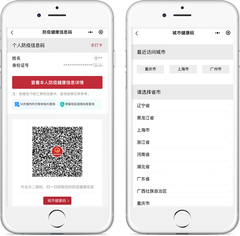 “防疫健康信息碼”為你的跨省出行保駕護(hù)航,關(guān)聯(lián)全國(guó)31個(gè)省(區(qū)、市)及新疆生產(chǎn)建設(shè)兵團(tuán)防疫“健康碼”信息,實(shí)現(xiàn)了信息共享和互通互認(rèn),全國(guó)絕大部分地區(qū)可“一碼通行”。