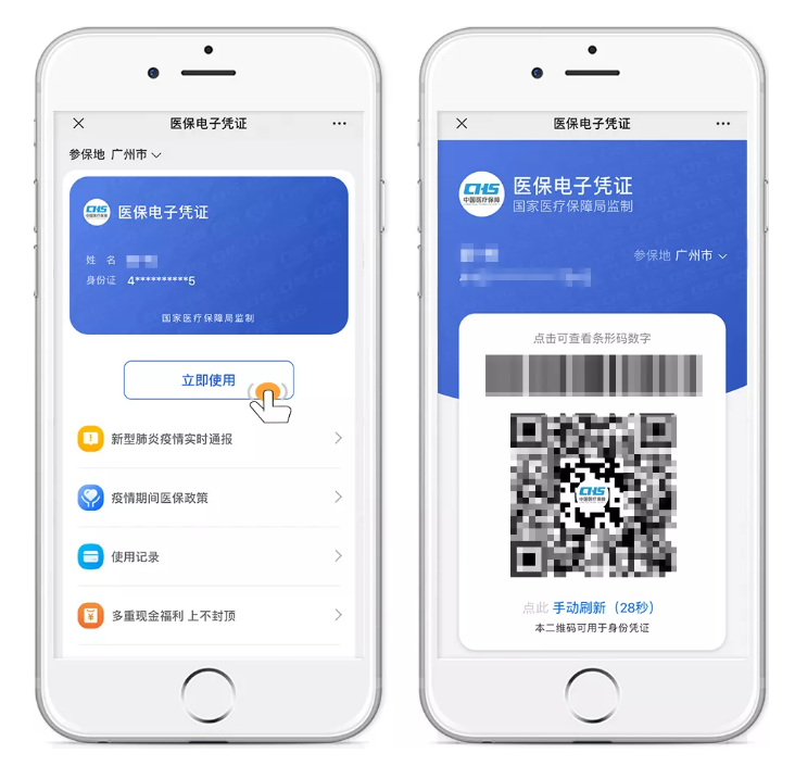在你需要掛號、支付醫(yī)藥費(fèi)、入院登記、出院結(jié)算、藥店買藥等時(shí)候,點(diǎn)擊醫(yī)保電子憑證下方的“立即使用”,將出現(xiàn)的條形碼和二維碼向醫(yī)院或藥店出示,即可“無接觸”完成驗(yàn)證支付。