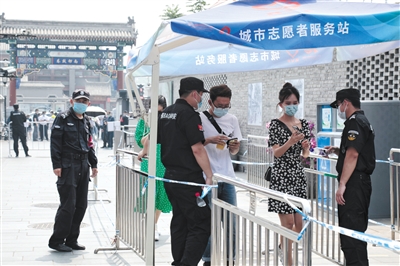 昨日,游客逛南鑼鼓巷前需要出示預約碼以及檢測體溫合格。新京報記者 王嘉寧 攝