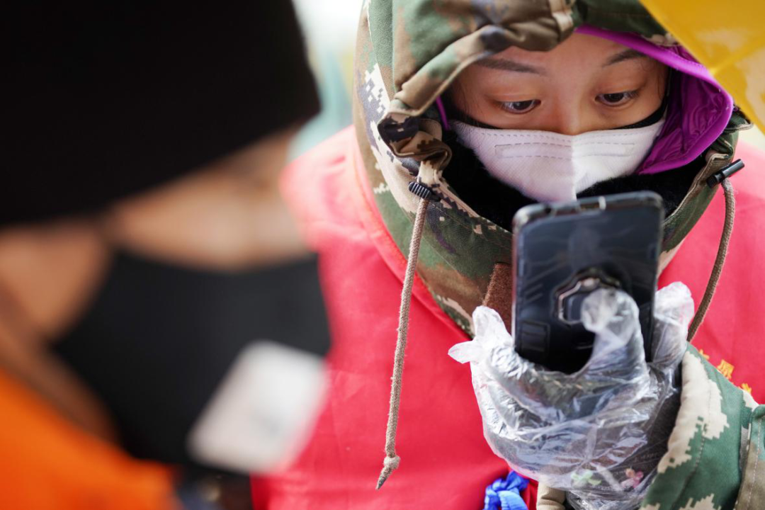 1993年出生的李文琦,是在深圳工作的哈爾濱人,春節返鄉回哈后成為社區志愿者。她說:“國家有難,我們‘90后’正值青年,身強力壯,應該往前沖。”圖為李文琦(右)在檢查往來車輛人員的手續證明。新華社記者 王建威/攝
