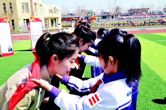 湯池鎮中心小學學生為高潘(左)系紅領巾。(受訪者供圖)