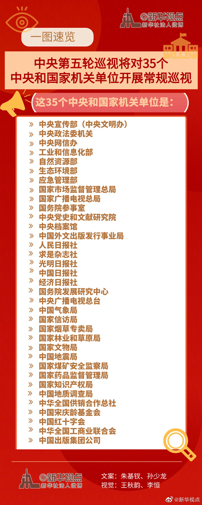 新華社北京5月9日電 經黨中央批準,十九屆中央第五輪巡視將對中央宣傳部(中央文明辦)、中央政法委機關、中央網信辦、工業和信息化部、自然資源部、生態環境部、應急管理部、國家市場監督管理總局、國家廣播電視總局、國務院參事室、中央黨史和文獻研究院、中央檔案館、中國外文出版發行事業局、人民日報社、求是雜志社、光明日報社、中國日報社、經濟日報社、國務院發展研究中心、中央廣播電視總臺、中國氣象局、國家信訪局、國家煙草專賣局、國家林業和草原局、國家文物局、中國地震局、國家煤礦安全監察局、國家藥品監督管理局、國家知識產權局、中國地質調查局、中華全國供銷合作總社、中國宋慶齡基金會、中國紅十字會、中華全國工商業聯合會、中國出版集團公司等35個中央和國家機關單位黨組織開展常規巡視。