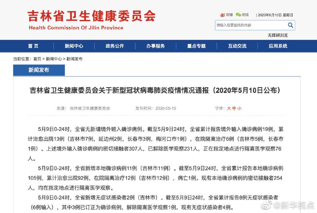 5月9日0-24時(shí),全省新增本地確診病例11例(吉林市11例)。截至5月9日24時(shí),全省累計(jì)報(bào)告本地確診病例105例,累計(jì)治愈出院92例,在院隔離治療12例(吉林市12例),病亡1例。現(xiàn)有本地確診病例的密切接觸者254人,均在指定地點(diǎn)進(jìn)行隔離醫(yī)學(xué)觀察。