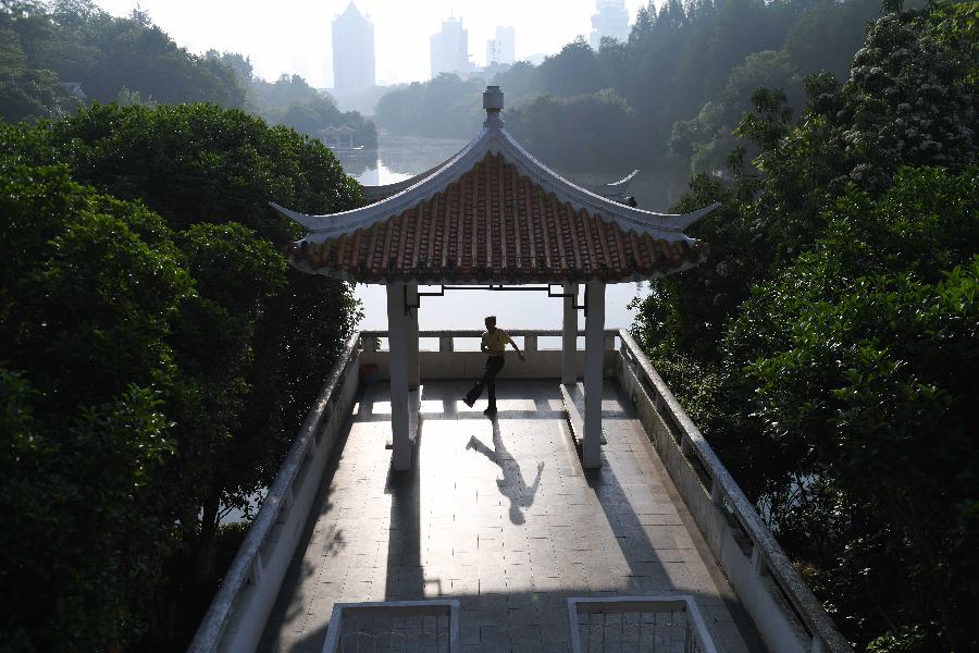 5月3日,市民在合肥市環城公園內晨練。 當日是“五一”假期第三天,合肥市民紛紛來到戶外,健身休閑,樂享假期。 新華社記者 張端 攝