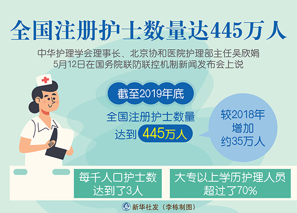 新華社北京5月12日電(記者王優(yōu)玲、王秉陽)中華護理學會理事長、北京協(xié)和醫(yī)院護理部主任吳欣娟12日在國務(wù)院聯(lián)防聯(lián)控機制新聞發(fā)布會上說,截至2019年底,全國注冊護士數(shù)量達到445萬人,較2018年增加約35萬人。每千人口護士數(shù)達到了3人,大專以上學歷護理人員超過了70%。