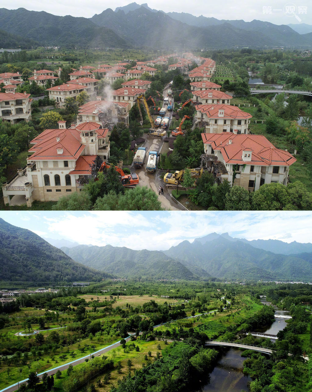 ?↑拼版照片:上圖為2018年9月,西安市長安區對轄區內東大街道的秦嶺違建別墅“群賢別業”進行拆除(新華社記者 邵瑞 攝);下圖為2019年7月拍攝的秦嶺違建別墅“群賢別業”拆除后建設的秦嶺和諧森林公園(新華社記者 劉瀟 攝)。