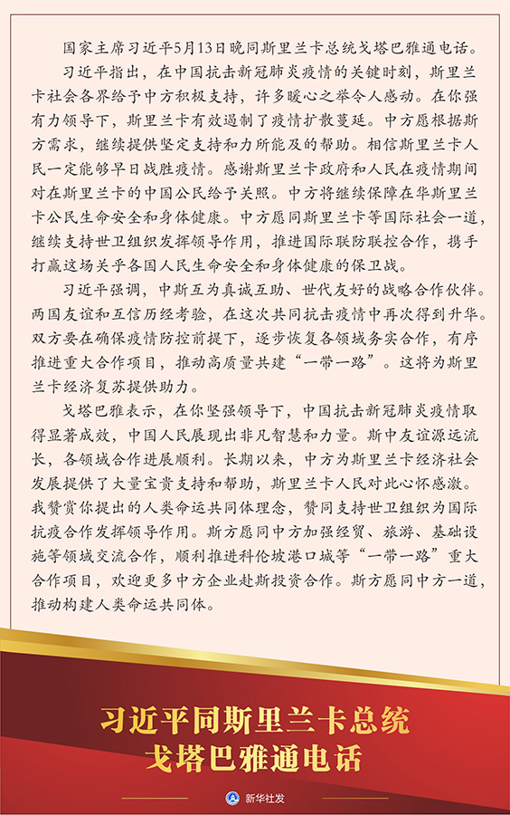 新華社北京5月13日電 國家主席習近平5月13日晚同斯里蘭卡總統戈塔巴雅通電話。