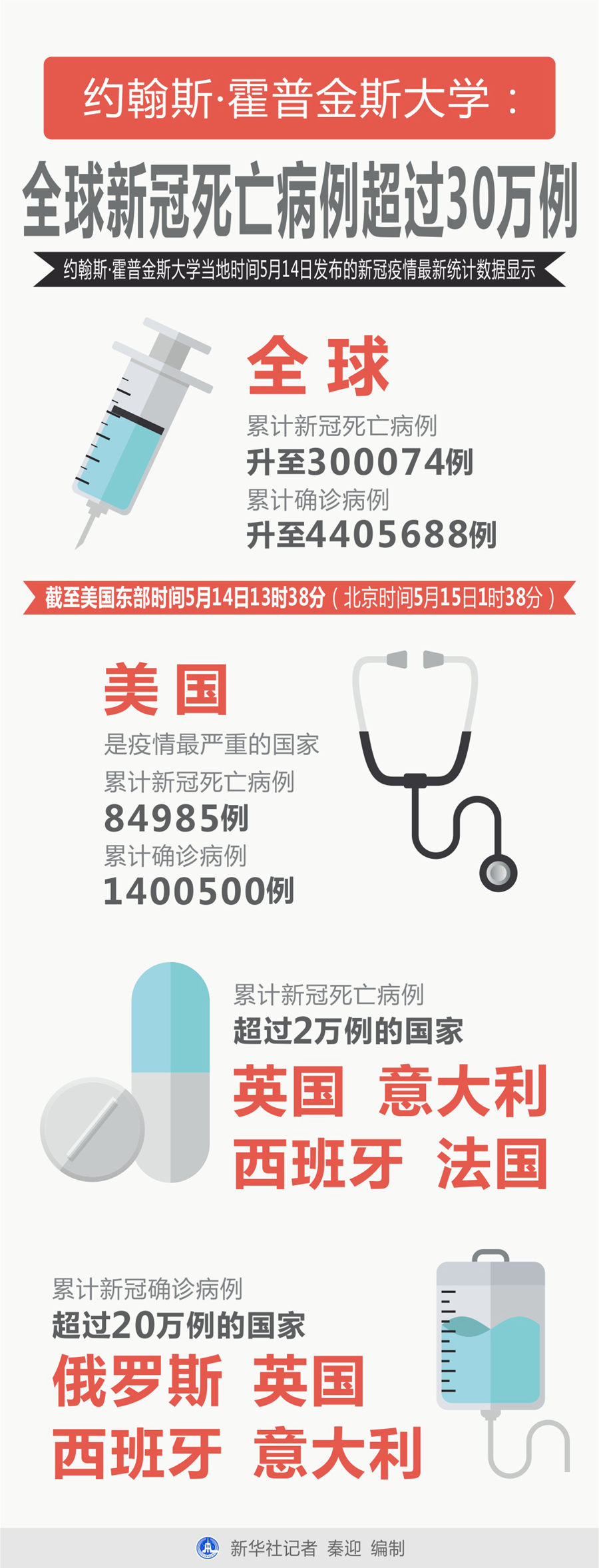 新華社紐約5月14日電 美國約翰斯·霍普金斯大學14日發(fā)布的新冠疫情最新統(tǒng)計數(shù)據(jù)顯示,全球累計新冠死亡病例超過30萬例。