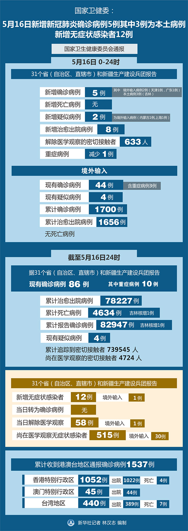 截至5月16日24時,據31個省(自治區、直轄市)和新疆生產建設兵團報告,現有確診病例86例(其中重癥病例10例),累計治愈出院病例78227例,累計死亡病例4634例(吉林核增1例),累計報告確診病例82947例(吉林核增1例),現有疑似病例4例。累計追蹤到密切接觸者739545人,尚在醫學觀察的密切接觸者4724人。
