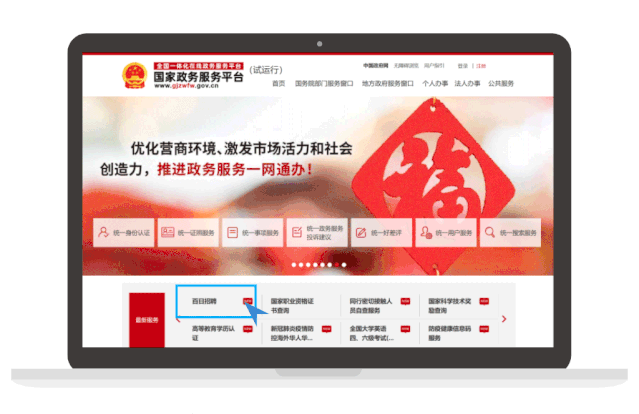 你可以通過電腦使用網頁搜索找到“國家政務服務平臺”后,首頁點擊“百日招聘”進入訪問,也可以點擊下方圖片直達“百日招聘”專題。