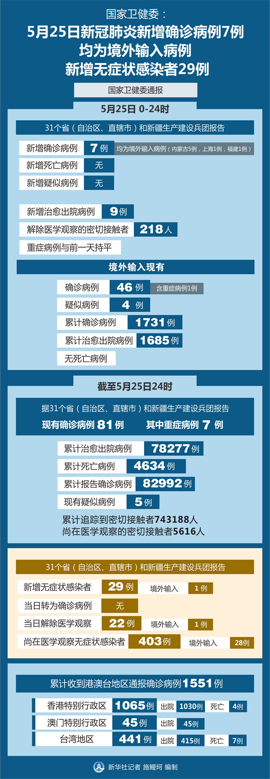 截至5月25日24時,據31個省(自治區、直轄市)和新疆生產建設兵團報告,現有確診病例81例(其中重癥病例7例),累計治愈出院病例78277例,累計死亡病例4634例,累計報告確診病例82992例,現有疑似病例5例。累計追蹤到密切接觸者743188人,尚在醫學觀察的密切接觸者5616人。
