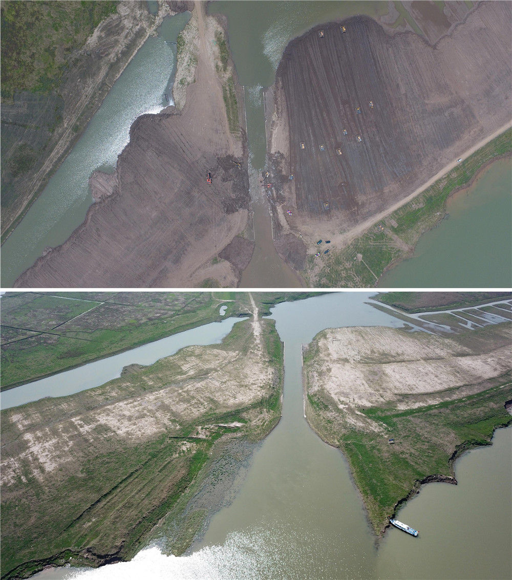 這是一張拼版照片。上圖:2018年6月15日,大型機械在下塞湖矮圍節制閘口作業(新華社記者丁春雨攝,無人機照片);下圖:2019年3月12日,下塞湖矮圍節制閘口經過爆破和清淤疏浚,堤壩已被鏟平,堤外湖與堤內水連通(新華社記者陳澤國攝,無人機照片)。新華社發