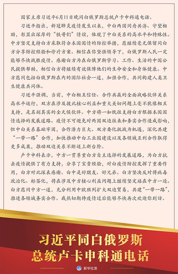 新華社北京6月11日電 國家主席習(xí)近平6月11日晚同白俄羅斯總統(tǒng)盧卡申科通電話。