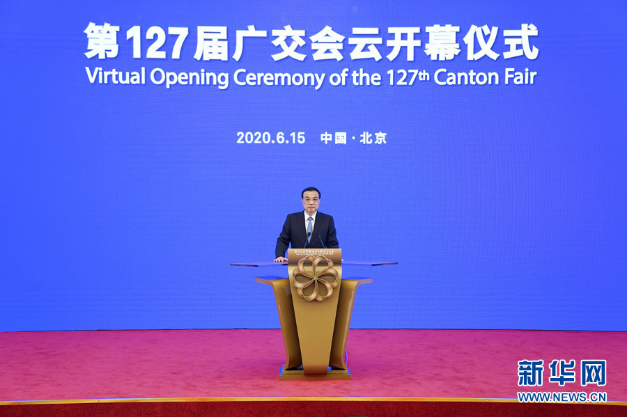 6月15日,中共中央政治局常委、國務(wù)院總理李克強(qiáng)在北京出席第127屆廣交會(huì)“云開幕”儀式。 新華社記者 張領(lǐng) 攝