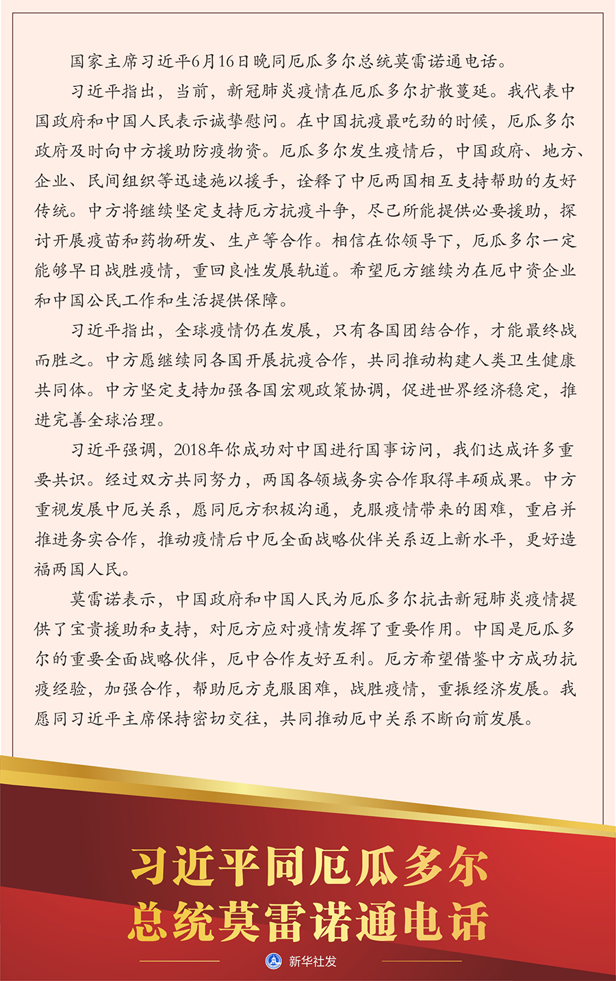 新華社北京6月16日電? 國家主席習近平6月16日晚同厄瓜多爾總統莫雷諾通電話。