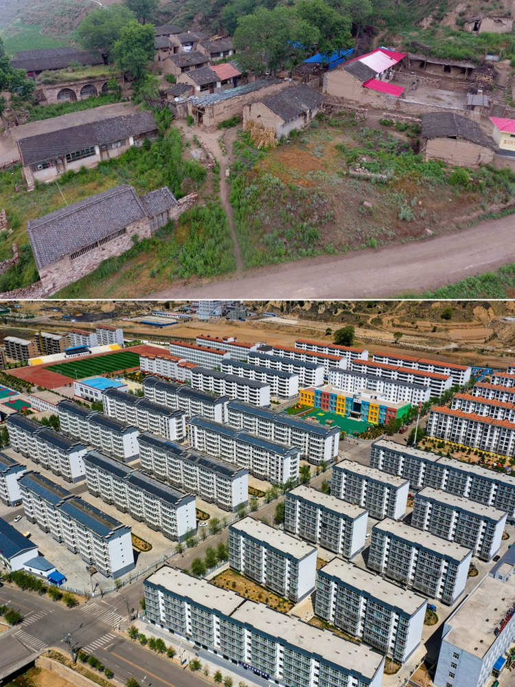 拼版照片:上圖為2017年6月22日拍攝的山西省忻州市岢嵐縣趙家洼村(無人機照片);下圖為5月20日拍攝的岢嵐縣廣惠園移民新區(qū),部分趙家洼村村民居住在這里(無人機照片)。新華社記者 曹陽 攝