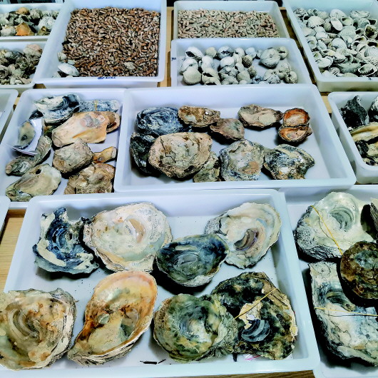 在這樣的環(huán)境下,先民們顯然先得靠海吃海。在基坑里,記者看到土層里夾雜著一層層的貝殼。在考古工地工作用房門外的走廊上,一排排裝滿各類貝殼的塑料箱摞了兩三層高。而在兩大間庫(kù)房里,各種海生貝類的貝殼擺了“好幾桌”,特別是那些巨大的牡蠣殼,大的足足有餐桌上的菜盆子那么大,由此想象一下,足以讓現(xiàn)代的老饕們垂涎三尺。
