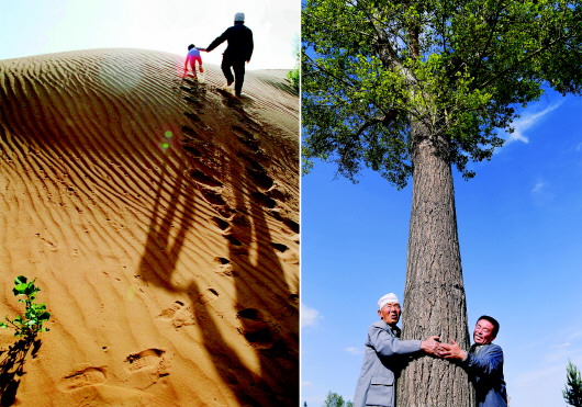 拼版照片左圖:1998年8月,榆林市靖邊縣郭成旺老人帶著曾孫行進(jìn)在沙漠中。老人的希望是:子子孫孫植樹(shù)造林,直到沙漠都變成綠洲;右圖:2020年5月22日,99歲的郭成旺老人(左)與孫兒郭建軍抱著當(dāng)年栽下的第一棵楊樹(shù),向參觀(guān)者介紹當(dāng)年植樹(shù)的情景。本報(bào)記者陶明攝