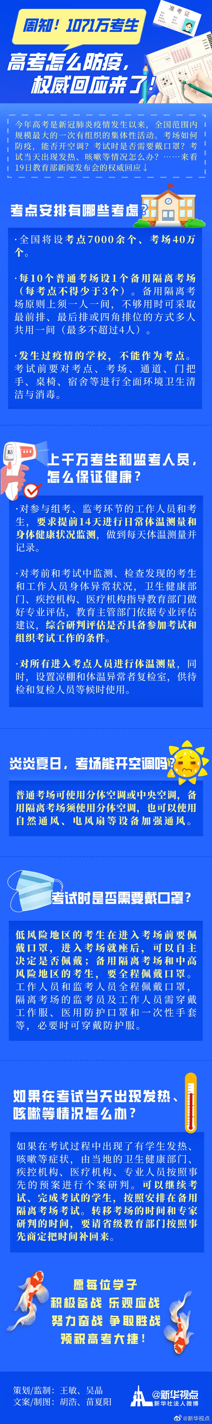 半個多月以后的7月7日和8日,1071萬考生將迎來人生當中的一次大考。今年高考是新冠肺炎疫情發生以來,全國范圍內規模最大的一次有組織的集體性活動。考場如何防疫,能否開空調?考試時是否需要戴口罩?考試當天出現發熱、咳嗽等情況怎么辦?……來看19日教育部新聞發布會的權威回應↓