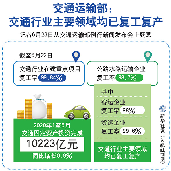 新華社北京6月23日電(魏玉坤、李麗華)記者23日從交通運輸部例行新聞發布會上獲悉,截至6月22日,交通行業在建重點項目復工率達到99.84%,公路水路運輸企業復工率達到98.7%,其中客運和貨運企業復工率分別達到98%、99.6%,交通行業主要領域均已復工復產。