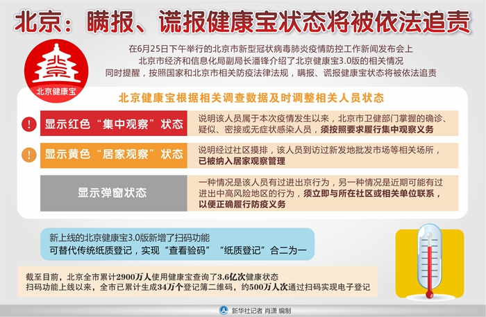 新華社北京6月25日電(記者魯暢)在25日下午舉行的北京市新型冠狀病毒肺炎疫情防控工作新聞發布會上,北京市經濟和信息化局副局長潘鋒介紹了北京健康寶3.0版的相關情況,同時提醒,按照國家和北京市相關防疫法律法規,瞞報、謊報健康寶狀態將被依法追責。