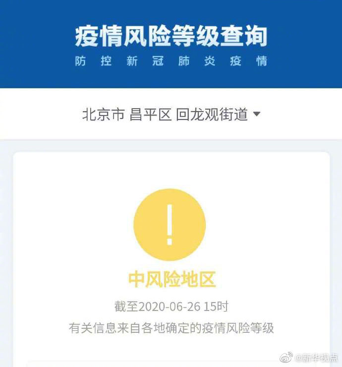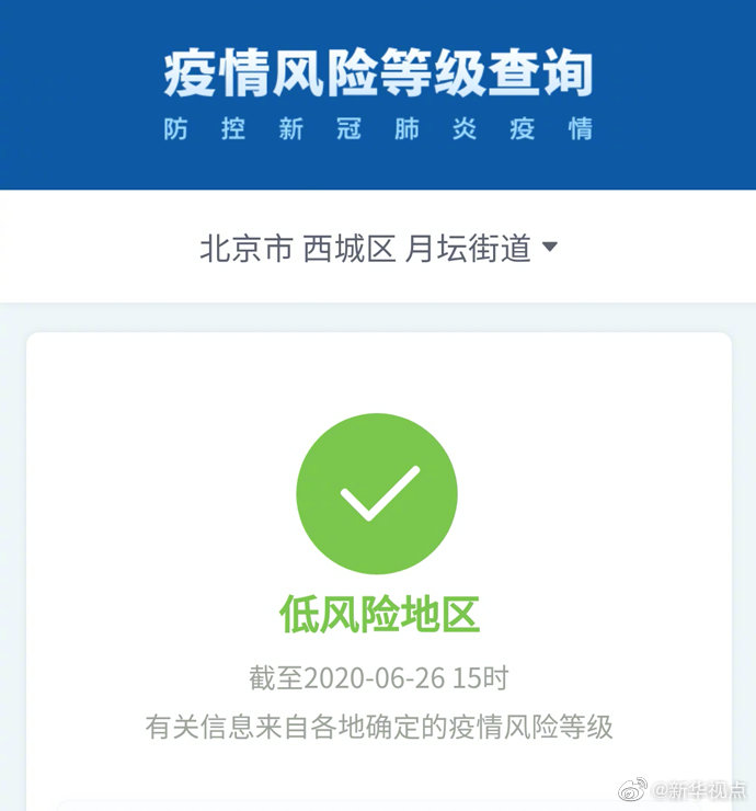 根據(jù)國務(wù)院客戶端小程序“疫情風(fēng)險等級查詢”,截至6月26日15時,北京市西城區(qū)月壇街道由中風(fēng)險地區(qū)變更為低風(fēng)險地區(qū)。海淀區(qū)四季青(地區(qū))鎮(zhèn)、昌平區(qū)回龍觀街道升級為中風(fēng)險地區(qū)。