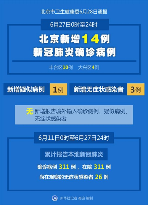 新華社北京6月28日電(記者俠克)北京市衛生健康委員會28日通報,27日0時至24時,北京市新增報告本地新冠肺炎確診病例14例、疑似病例1例、無癥狀感染者3例;無新增報告境外輸入新冠肺炎確診病例、疑似病例、無癥狀感染者。