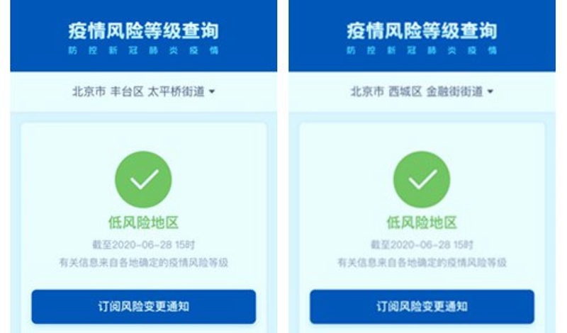 記者從國務院客戶端小程序“疫情風險等級查詢”上了解到,截至6月28日15時,北京市西城區金融街街道、豐臺區太平橋街道由疫情中風險地區變更為低風險地區。
