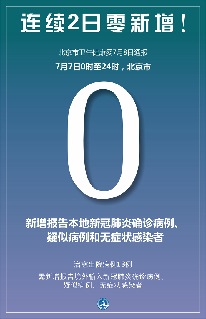 新華社北京7月8日電(記者俠克)北京市衛(wèi)生健康委8日通報,7月7日0時至24時,北京市無新增報告本地新冠肺炎確診病例、疑似病例和無癥狀感染者,治愈出院病例13例;無新增報告境外輸入新冠肺炎確診病例、疑似病例、無癥狀感染者。北京市連續(xù)2日無新增確診病例。