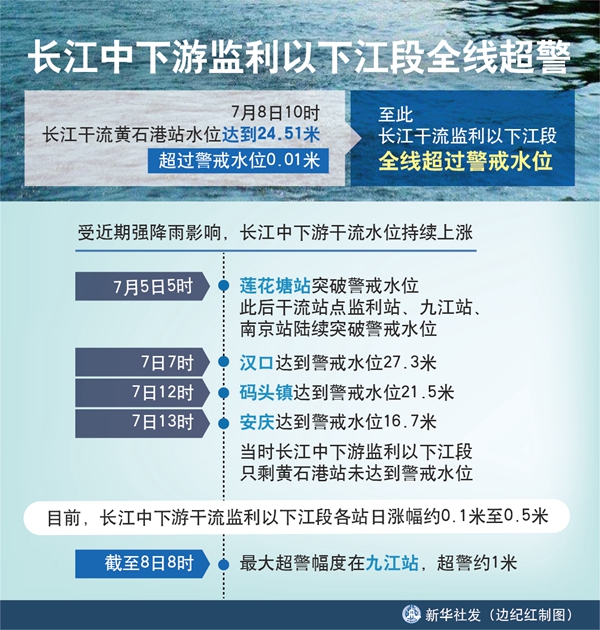 新華社武漢7月8日電(記者李思遠、樂文婉)8日10時,長江干流黃石港站水位達到24.51米,超過警戒水位0.01米。至此,長江干流監利以下江段全線超過警戒水位。
