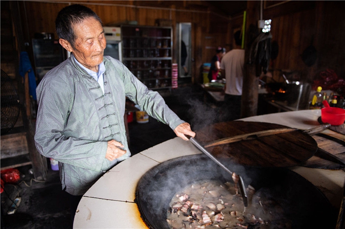 在湘西十八洞村,82歲的施成富在自家的農家樂里炒臘肉(6月29日攝)。新華社記者 陳思汗 攝