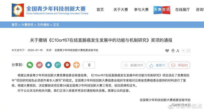 全國青少年科技創新大賽組委會16日發布通報,根據云南省青少年科技創新大賽競賽組委會核查結果,《C10orf67在結直腸癌發生發展中的功能與機制研究》項目違反了競賽規則中“項目研究報告必須是作者本人撰寫”的規定。全國青少年科技創新大賽組委會組織專家組對云南省競賽組委會提供的材料進行了復核,根據大賽規則,決定撤銷該項目第34屆全國青少年科技創新大賽三等獎,收回獎牌和證書。對于公眾關注的相關問題,正深入核查并將及時通報相關進展。