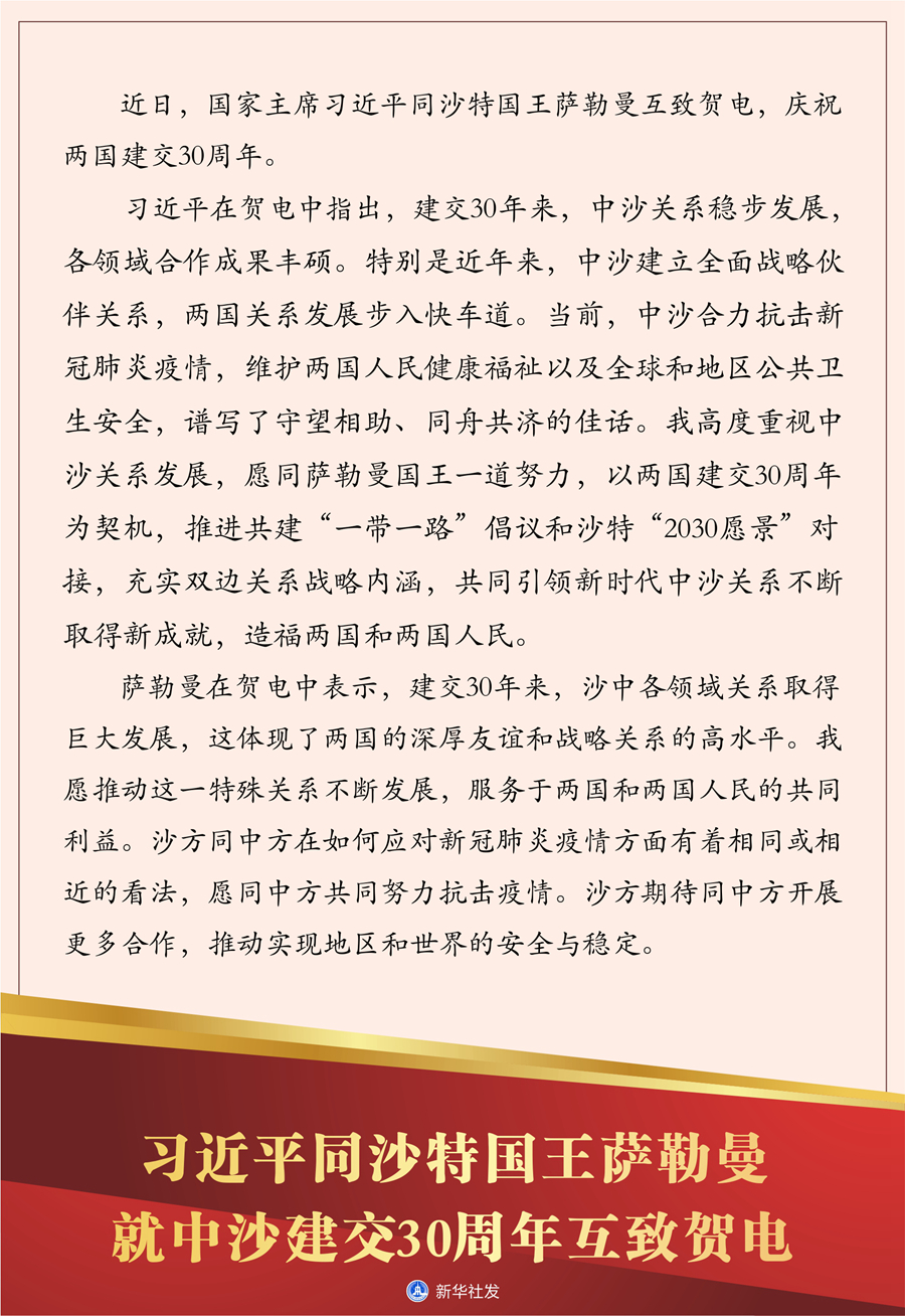 習近平在賀電中指出,建交30年來,中沙關系穩步發展,各領域合作成果豐碩。特別是近年來,中沙建立全面戰略伙伴關系,兩國關系發展步入快車道。當前,中沙合力抗擊新冠肺炎疫情,維護兩國人民健康福祉以及全球和地區公共衛生安全,譜寫了守望相助、同舟共濟的佳話。我高度重視中沙關系發展,愿同薩勒曼國王一道努力,以兩國建交30周年為契機,推進共建“一帶一路”倡議和沙特“2030愿景”對接,充實雙邊關系戰略內涵,共同引領新時代中沙關系不斷取得新成就,造福兩國和兩國人民。
