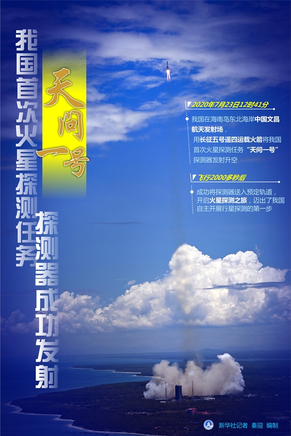 2020年7月23日12時41分,我國在海南島東北海岸中國文昌航天發射場,用長征五號遙四運載火箭將我國首次火星探測任務“天問一號”探測器發射升空,飛行2000多秒后,成功將探測器送入預定軌道,開啟火星探測之旅,邁出了我國自主開展行星探測的第一步。 新華社記者 趙穎全 攝